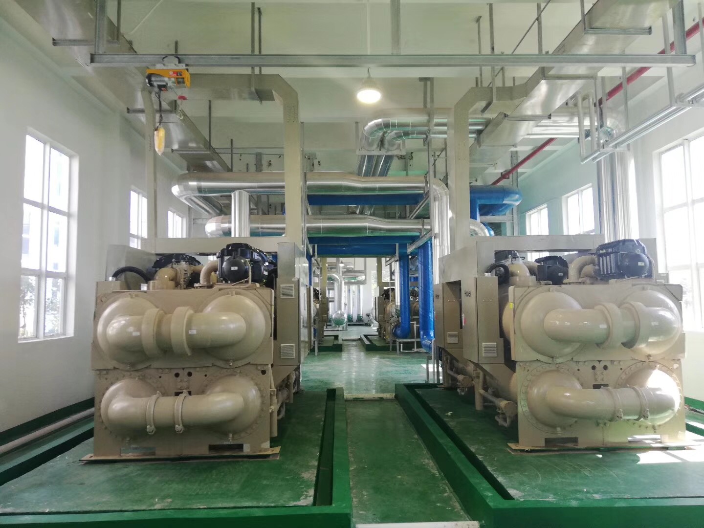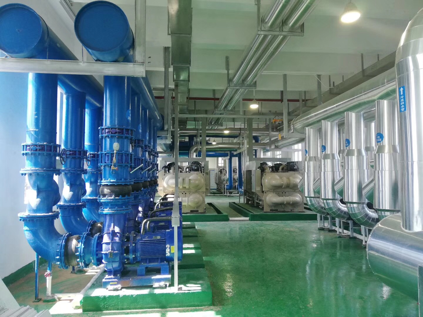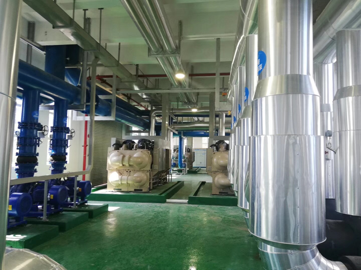 目前,由我司施工的江西吉安中央空调安装项目中设备房里的设备以及水泵部分等已安装完毕
