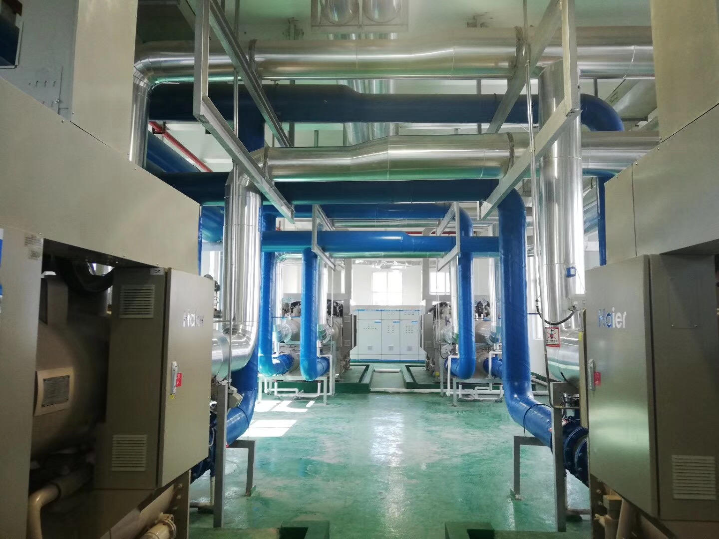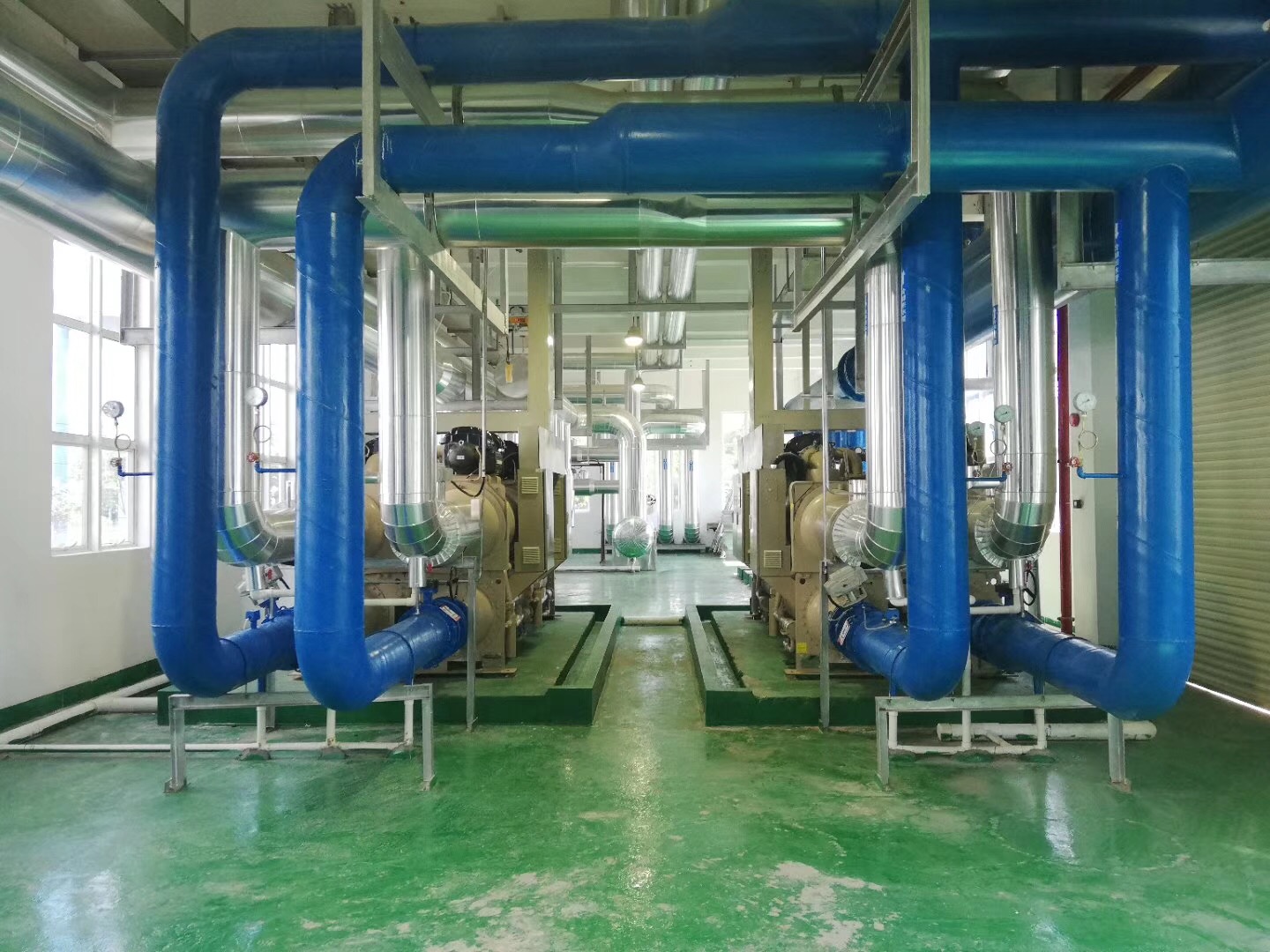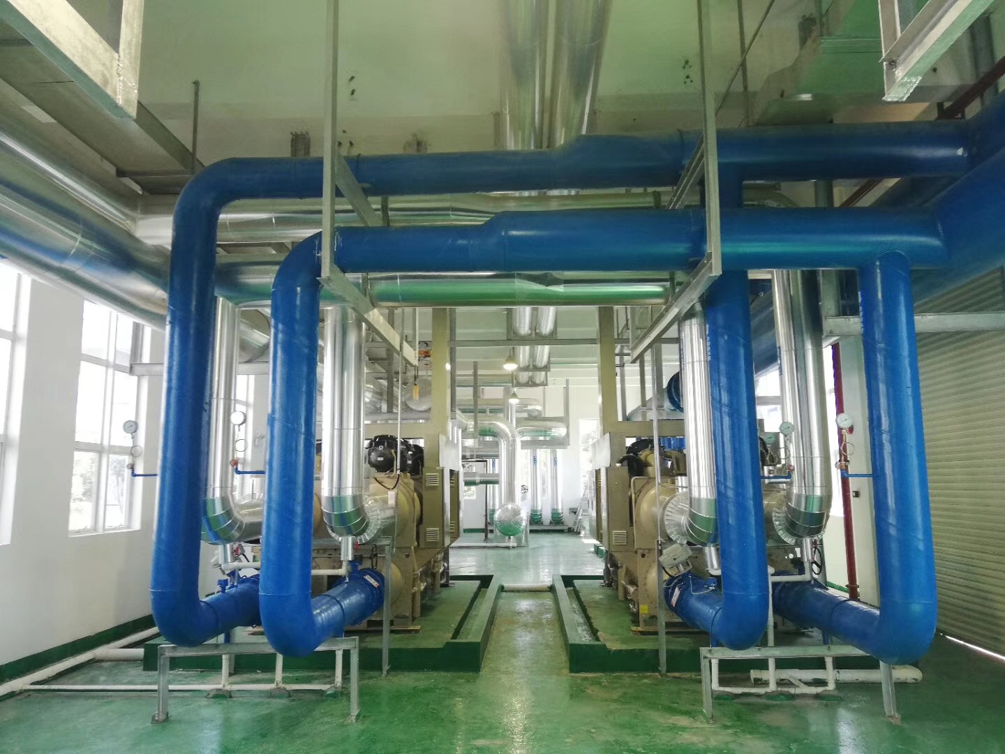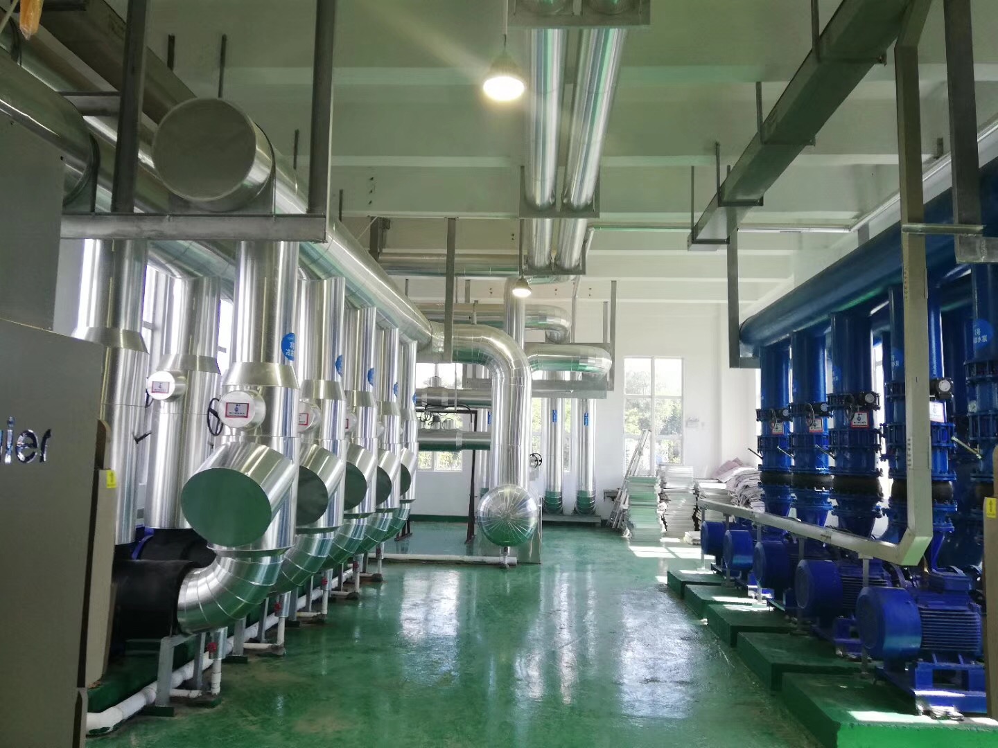 目前,由我司施工的江西吉安中央空调安装项目中设备房里的设备以及水泵部分等已安装完毕